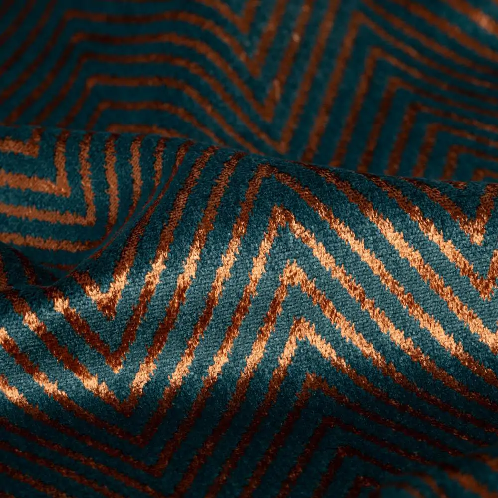 HERMINE Emerald-08 to wysokiej jakości tkanina obiciowa (i dekoracyjna), zaprojektowany z myślą o nowoczesnych i klasycznych wnętrzach. Atutem są również trendowe połączenia miedzi i złota ze szlachetnymi głębokimi odcieniami petrolu, błękitu oraz szarości. Wzór ten idealnie sprawdzi się w pomieszczeniach o stylu nowoczesnym i klasycznym. Hermine rekomendowany jest do użytku tapicerskiego, do uszycia poduszek i wałków. Może być łączony z innymi wzorami z kolekcji Modern classics oraz z gładkim welurowym koordynatem Henry FR. Hermine utrzymany jest w stylistyce Art Deco ze względu na elegancki połysk, geometryczną powtarzalność wzoru i dobór kolorystyczny. Sprawdzi się zarówno w przestrzeniach mieszkalnych, jak i komercyjnych, gdzie liczy się estetyka oraz funkcjonalność.