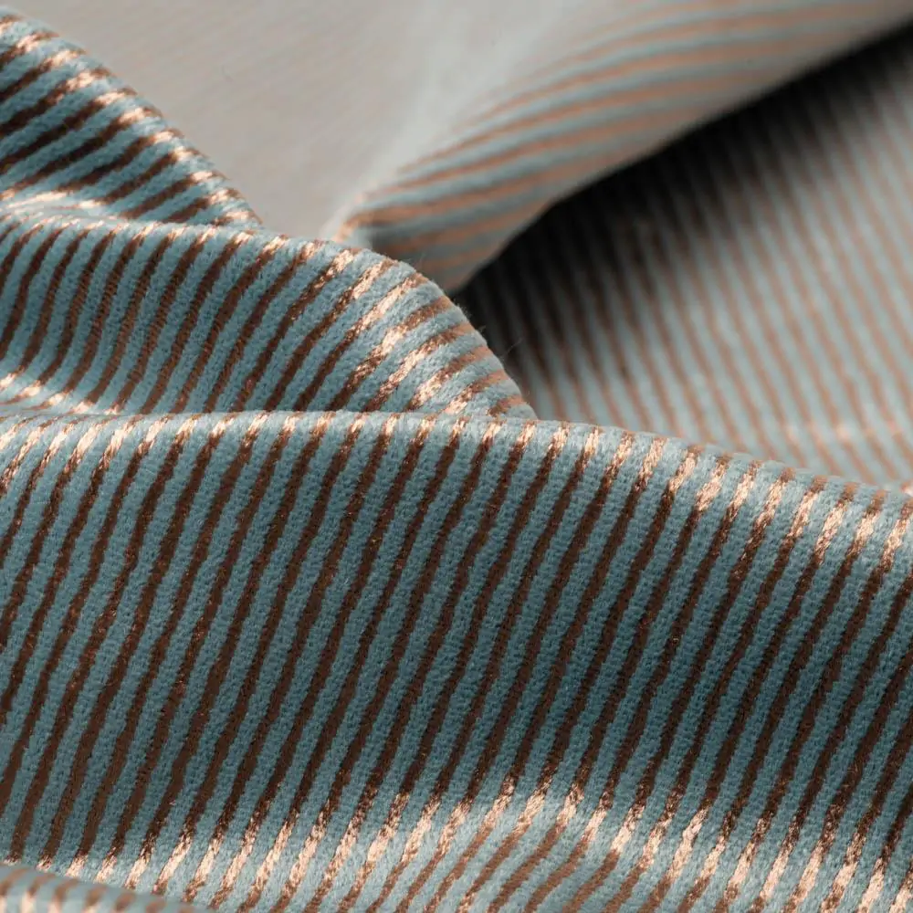 NICOLE Aquamarine-12 to wysokiej jakości tkanina obiciowa (i dekoracyjna), zaprojektowany z myślą o nowoczesnych i klasycznych wnętrzach. Atutem są również trendowe połączenia miedzi i złota ze szlachetnymi głębokimi odcieniami petrolu, błękitu oraz szarości. Charakterny wzór idealnie sprawdzi się w pomieszczeniach o stylu nowoczesnym i klasycznym. Nicole rekomendowana jest do użytku tapicerskiego, do stworzenia poduszek i wałków. Może być łączona z innymi wzorami z kolekcji Modern classics np. Hermine oraz z gładkim welurowym koordynatem Henry FR. Wzór, którego inspiracje sięgają stylu art deco ze względu na proste linearne rytmy, a także na elegancki połysk i dobór kolorystyczny. Sprawdzi się zarówno w przestrzeniach mieszkalnych, jak i komercyjnych, gdzie liczy się estetyka oraz funkcjonalność.