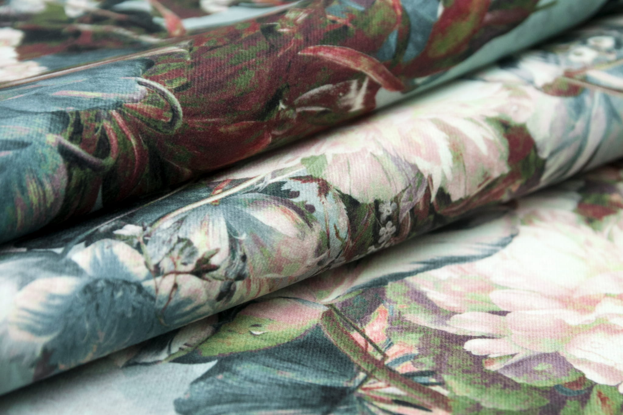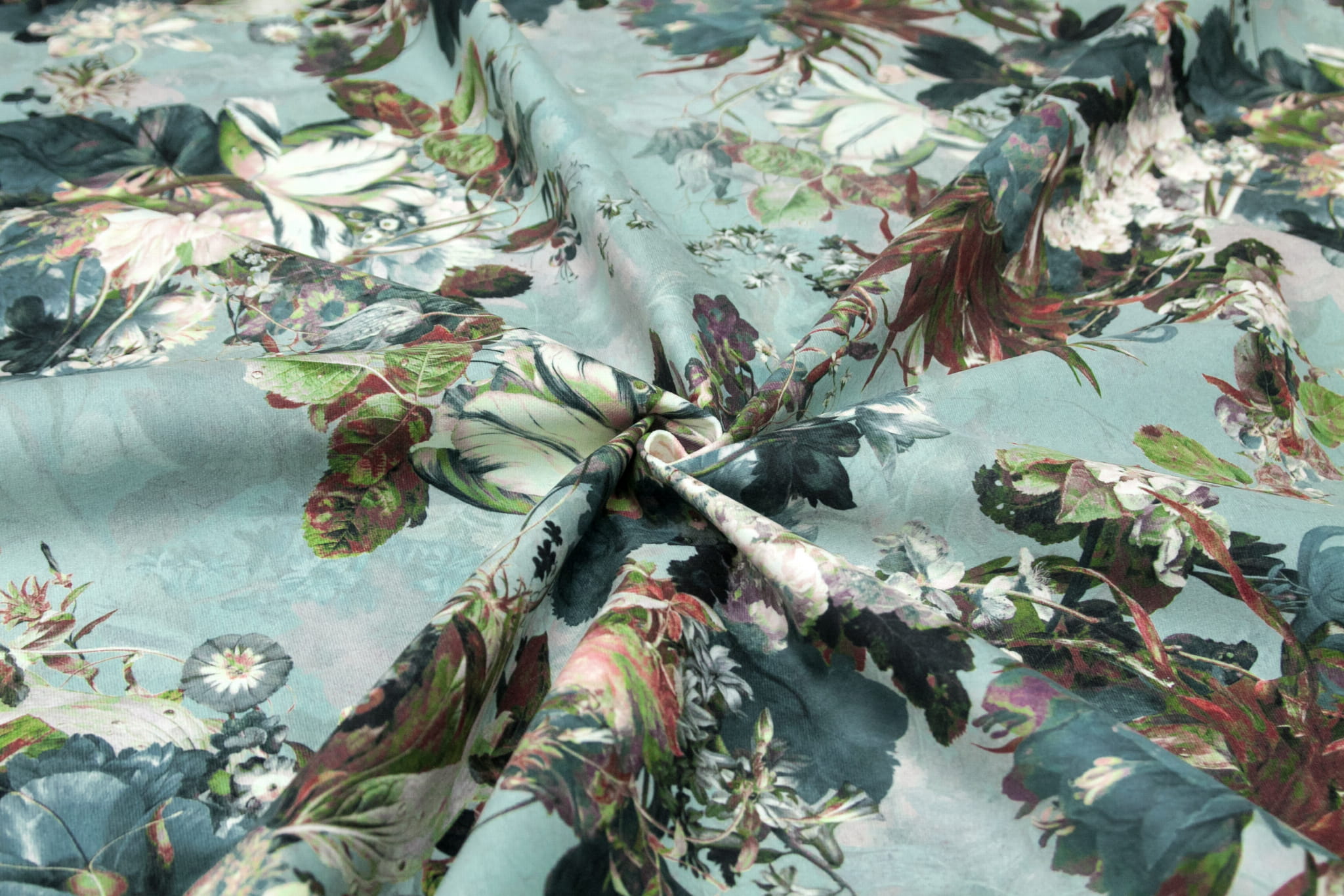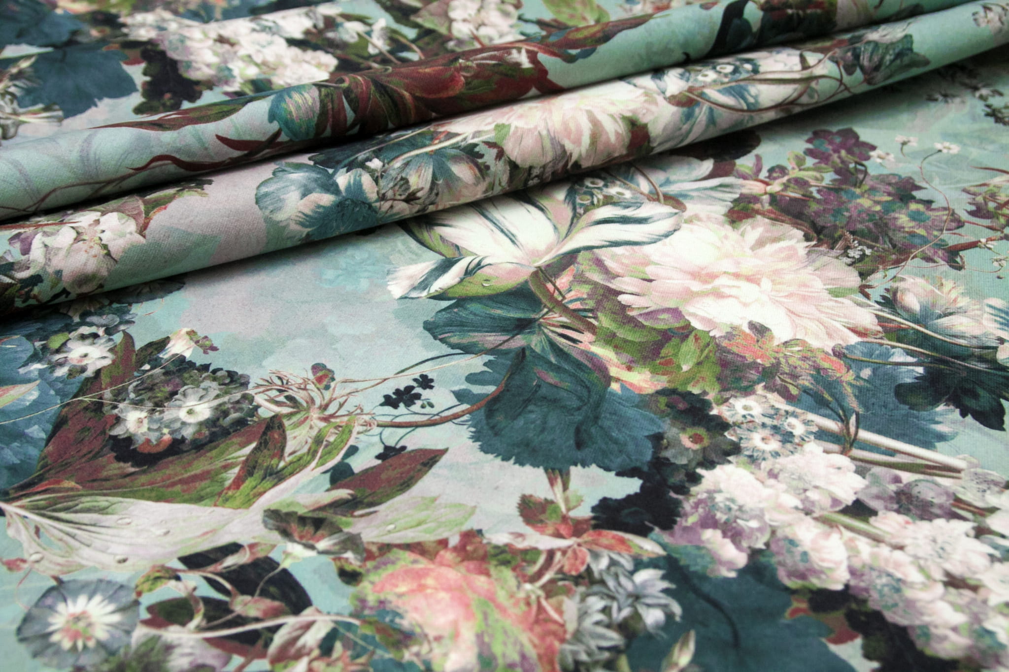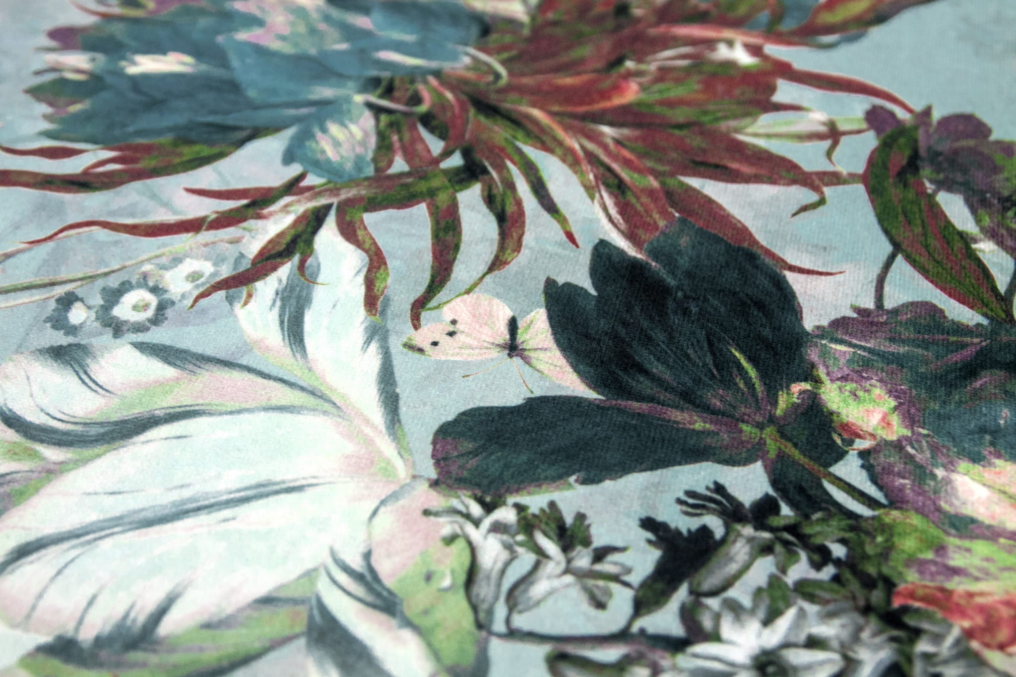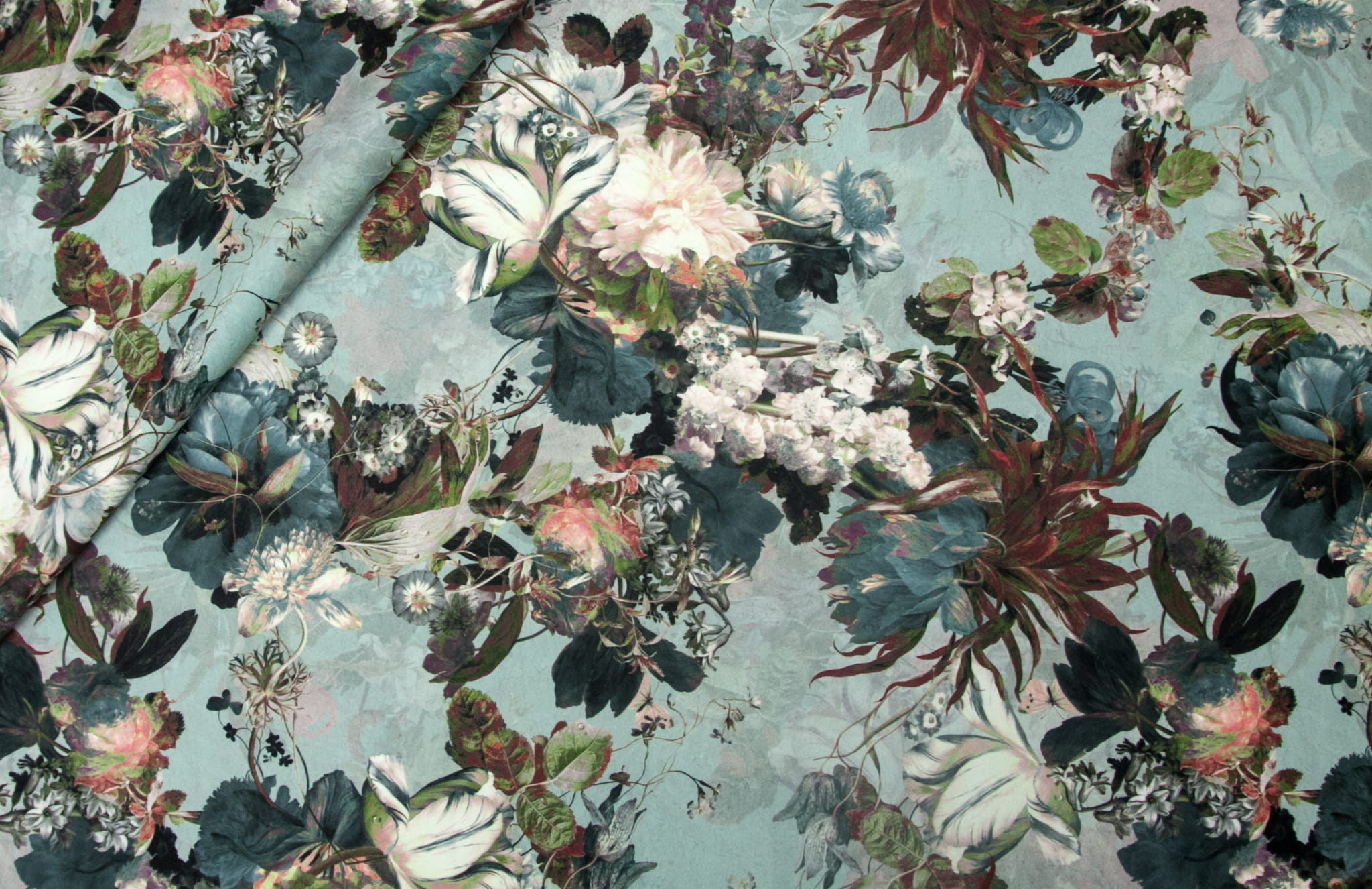 Baroque to elegancki i przepiękny welur obiciowy z bogatym kwiatowym wzorem w odcieniach niebieskiego, zieleni, różu i brązu.