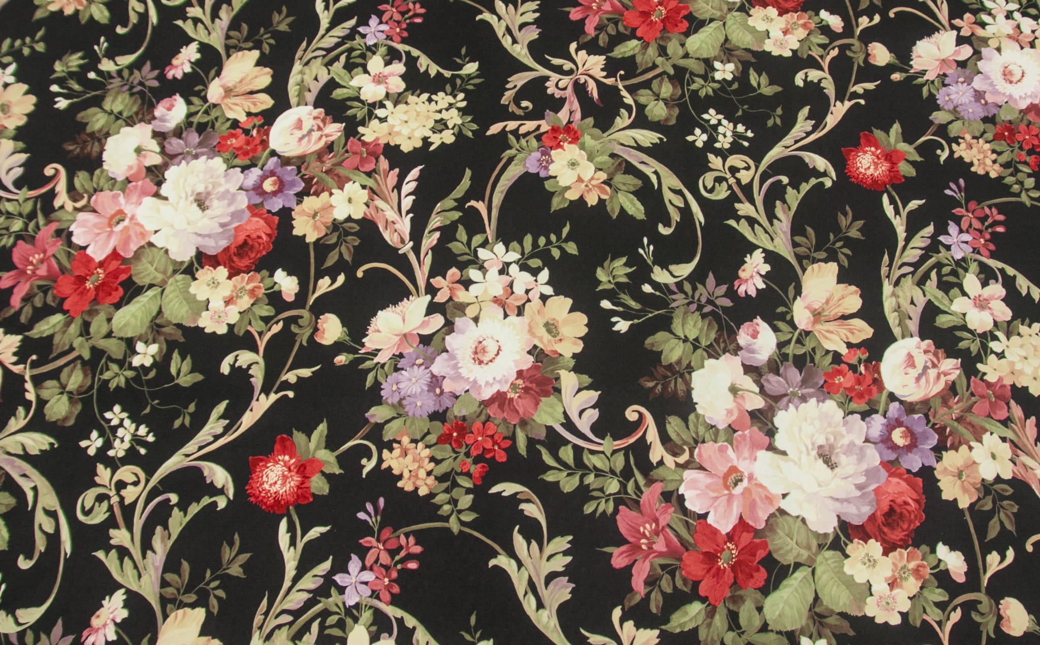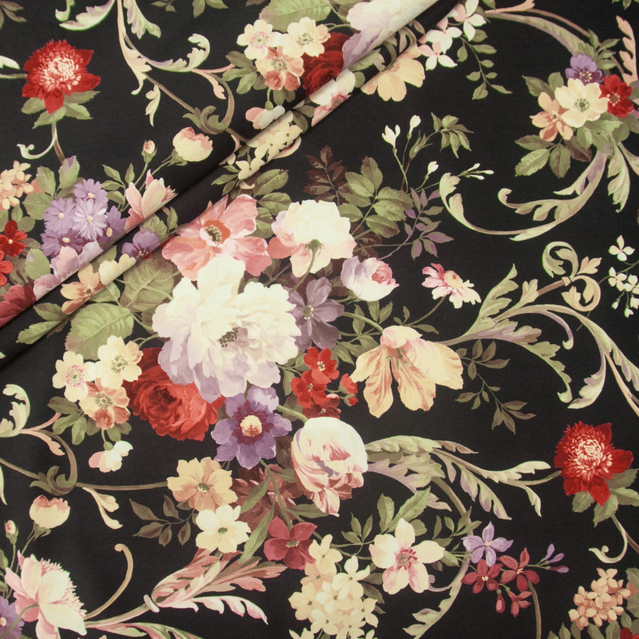 Bouquet to elegancki i przepiękny welur obiciowy z bogatym kwiatowym wzorem w odcieniach różu, fioletu, żółci i zieleni na czarnym tle.