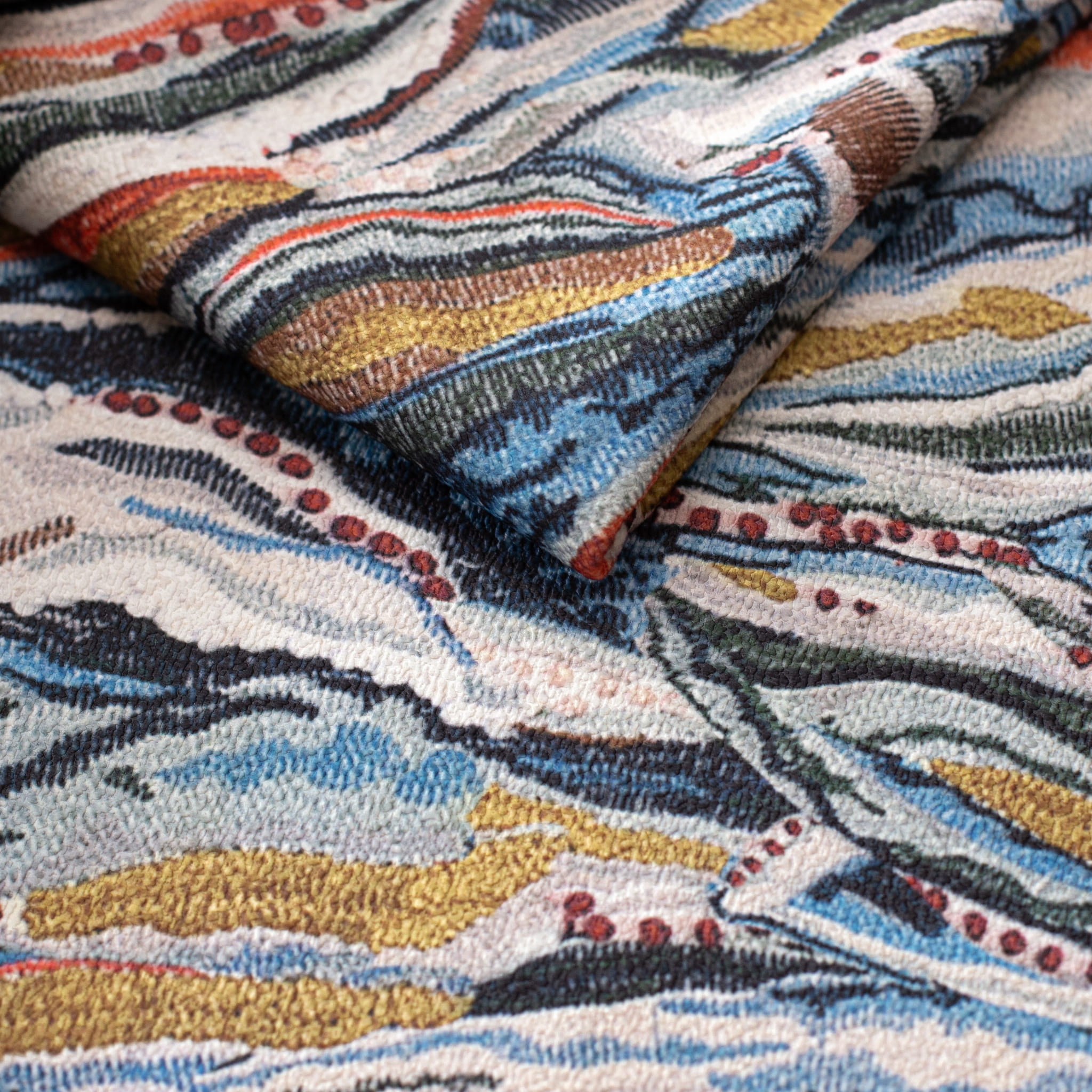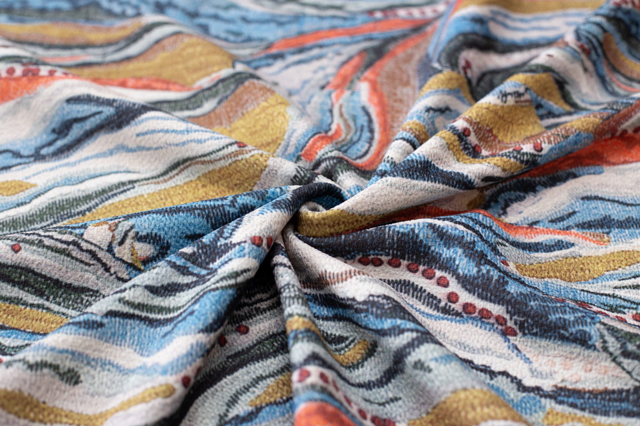 Salvador to mocny i mięsisty welur, bardzo przyjemny w dotyku. Materiał pomimo swej wysokiej gramatury bardzo dobrze się układa. Tkanina jest trudnopalna co pozwala na zastosowanie jej w miejscach użyteczności publicznej. Ze względu na łatwość czyszczenia oraz śliskość materiału polecana jest właścicielom zwierząt domowych. Print to nieregularne kształty w odcieniach niebieskiego, rudego i musztardy na cieniowanym jasno szarym tle. Kolory tkanin zaprezentowane na zdjęciach mogą się różnić od rzeczywistych – wynika to z ograniczeń techniki zapisu cyfrowego oraz wyświetlania obrazu na poszczególnych urządzeniach elektronicznych oraz indywidualnych ustawień tych urządzeń- w szczególności monitora i karty graficznej. Welur tapicerski o delikatnej, tłoczonej strukturze z pięknym kolorowym wzorem.